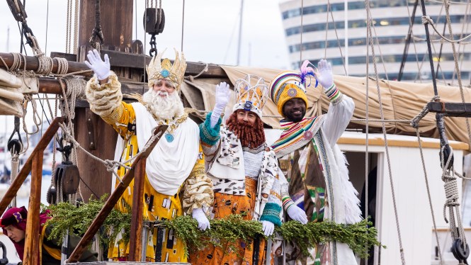 La tarde del 5 de enero, a las 16h, los Reyes Magos llegaran en el Pailebot Santa Eulàlia, con su impresionante séquito. Después de la tradicional ceremonia de bienvenida, Sus Ilustres Majestades de Oriente pasearán por diversas calles de la ciudad repartiendo caramelos entre los niños y niñas como preludio de una noche única.